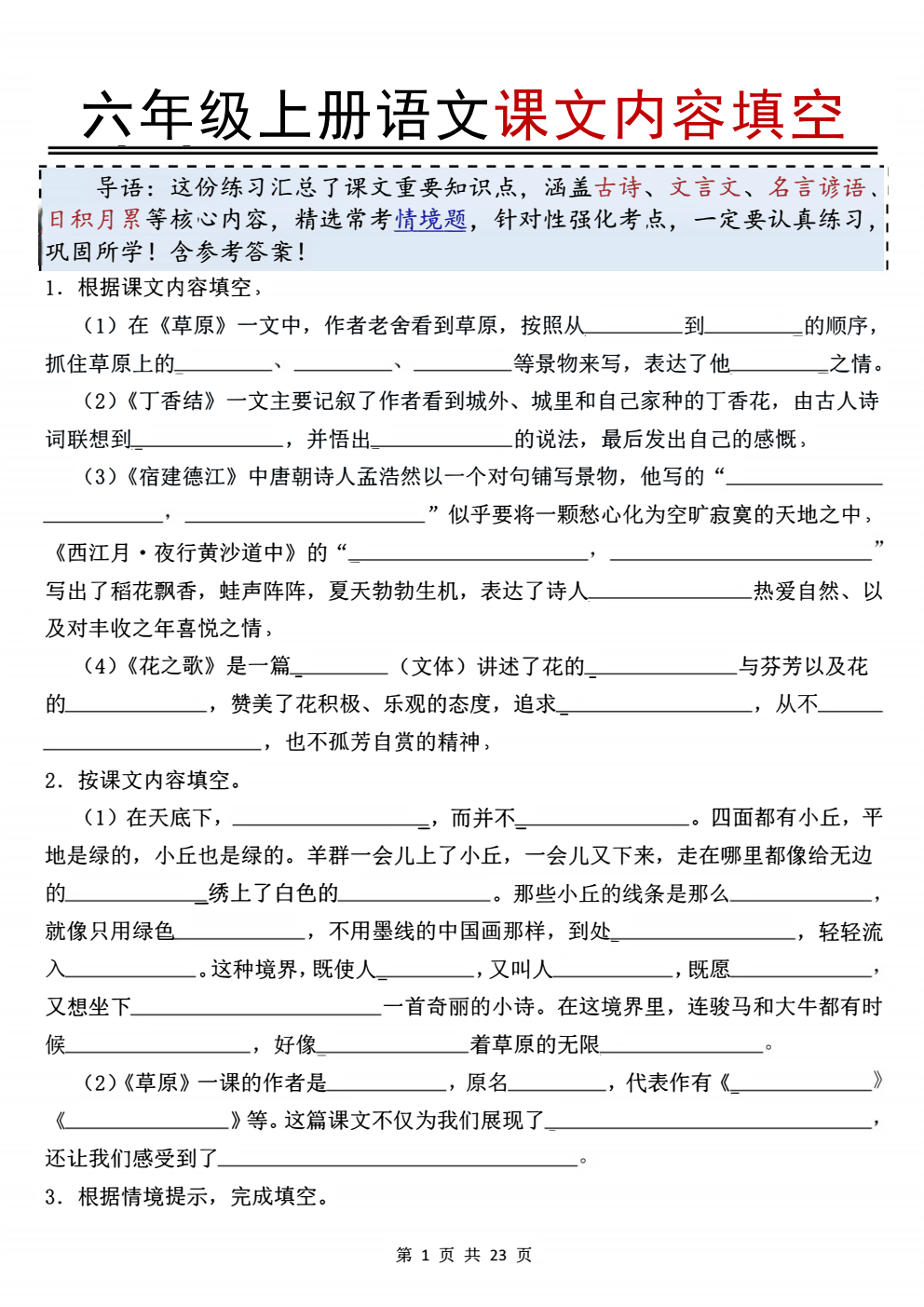 《六年级上册语文课文内容填空》专项资料现已上线!本资料紧密围绕教材核心内容,系统梳理了全册重点课文的经典段落、古诗词名句及文学常识要点,以填空形式帮助学生检测对课文的理解与记忆程度。适合学生自主复习、课堂检测及期中期末备考使用,有效提升知识掌握熟练度与语言积累能力。快来下载练习,巩固基础,轻松应对语文学习挑战!