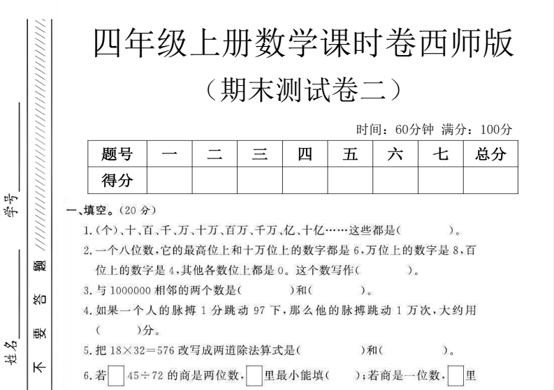 知学资源网为您提供《四年级上数学期末测试卷二(西师版)》,题型覆盖计算、应用题、几何等核心考点,难度适中,适合期末检测与查漏补缺。试卷附参考答案,方便家长辅导与教师备课使用,欢迎下载打印。