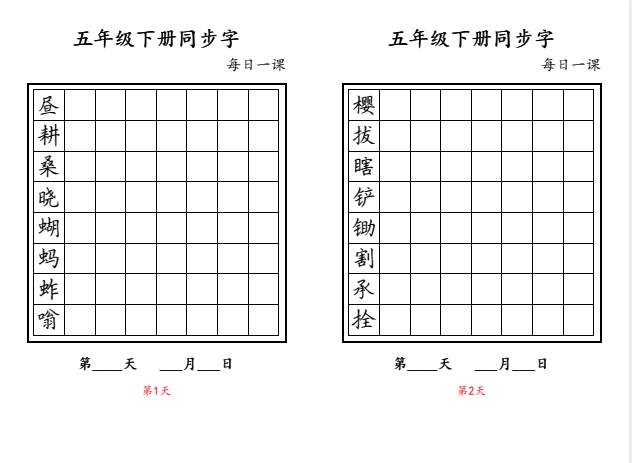 本资源为五年级下册语文同步写字表字帖,涵盖教材全部生字,按课编排,每日一课,帮助孩子循序渐进掌握汉字书写规范。字帖注重结构与笔顺指导,适合课后巩固或假期练习,提升书写工整度与语文基础能力。下载即用,方便家长辅导与学生自学。