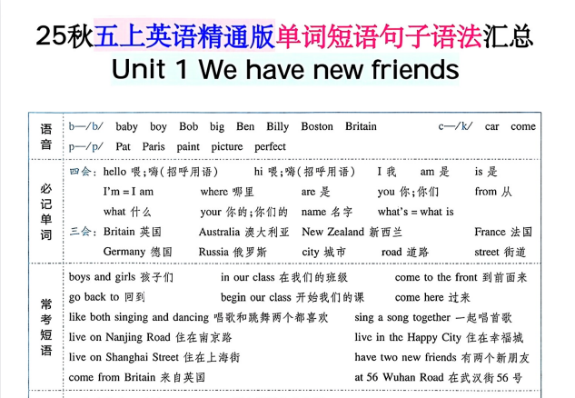 本资源针对人教精通版五年级上册英语教材,全面汇总各单元核心单词、常用短语、重点句子及语法要点。内容系统分类,便于同步学习或期末复习,帮助学生高效掌握课内核心知识,提升英语综合运用能力。附典型例句与考点提示,适合学生自查、家长辅导。知学资源网持续整理优质学习资料,欢迎下载使用。