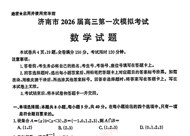 2026届济南市高三第一次模拟考试已于近日结束,本站整理提供全科完整试题与权威参考答案,覆盖语文、数学、英语等各科目。本次模考紧扣高考命题趋势,适合考生自我检测与复习定位,帮助查漏补缺、提升应试能力。欢迎下载使用,助力高考冲刺备考!