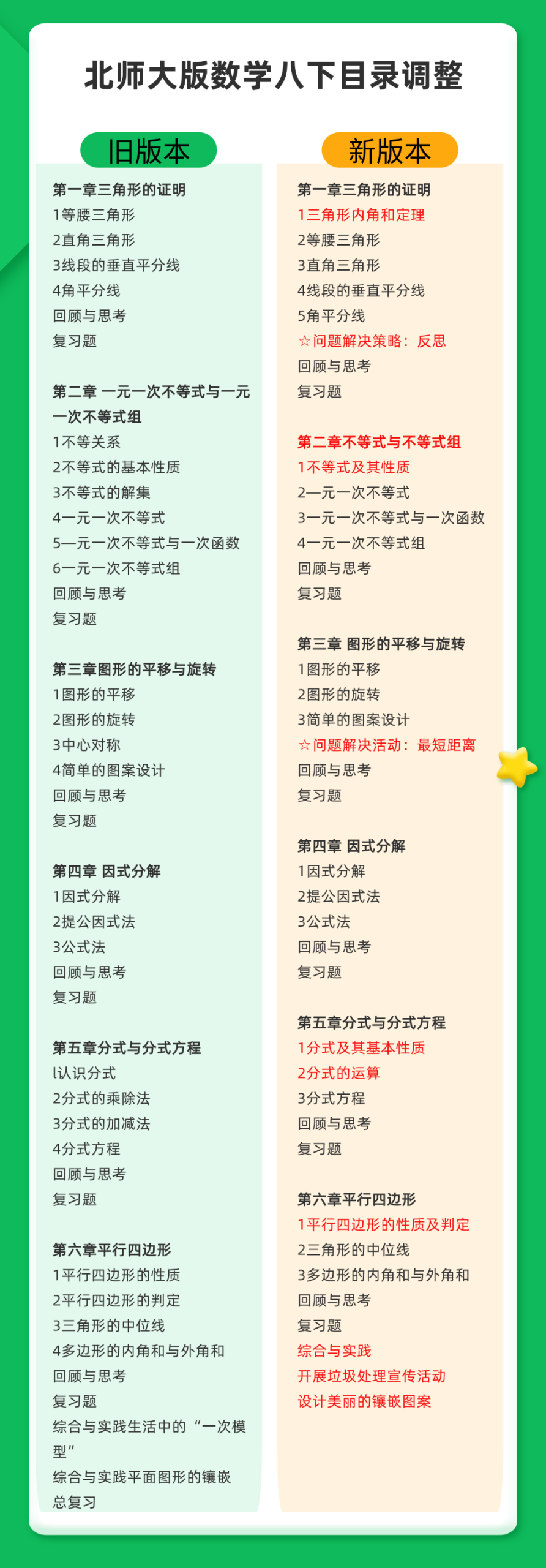 将知识点拆分、重组或调整顺序,并增加新的知识点;关注性质、结论的推导过程,加强实际应用与尺规作图。