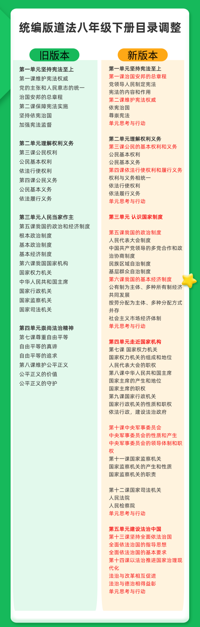 新增内容:新增第十课《中央军事委员会》;新增第五单元《建设法治中国》,包含第十三课《坚持全面依法治国》和第十四课《以法治推进国家治理现代化》两课,强化宪法与法治教育主线。