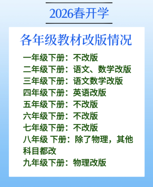 中小学所有年级的教材更换也已进入最后倒计时。想必各位老师都知道,2026年春季学期起,义务教育所有年级(小学1-6年级、初中7-9年级)将全面启用新版教材。