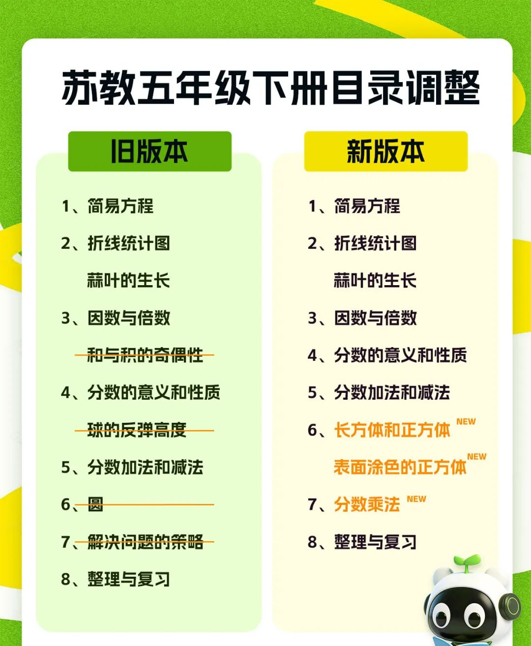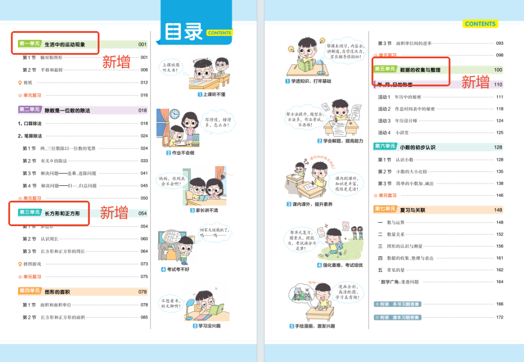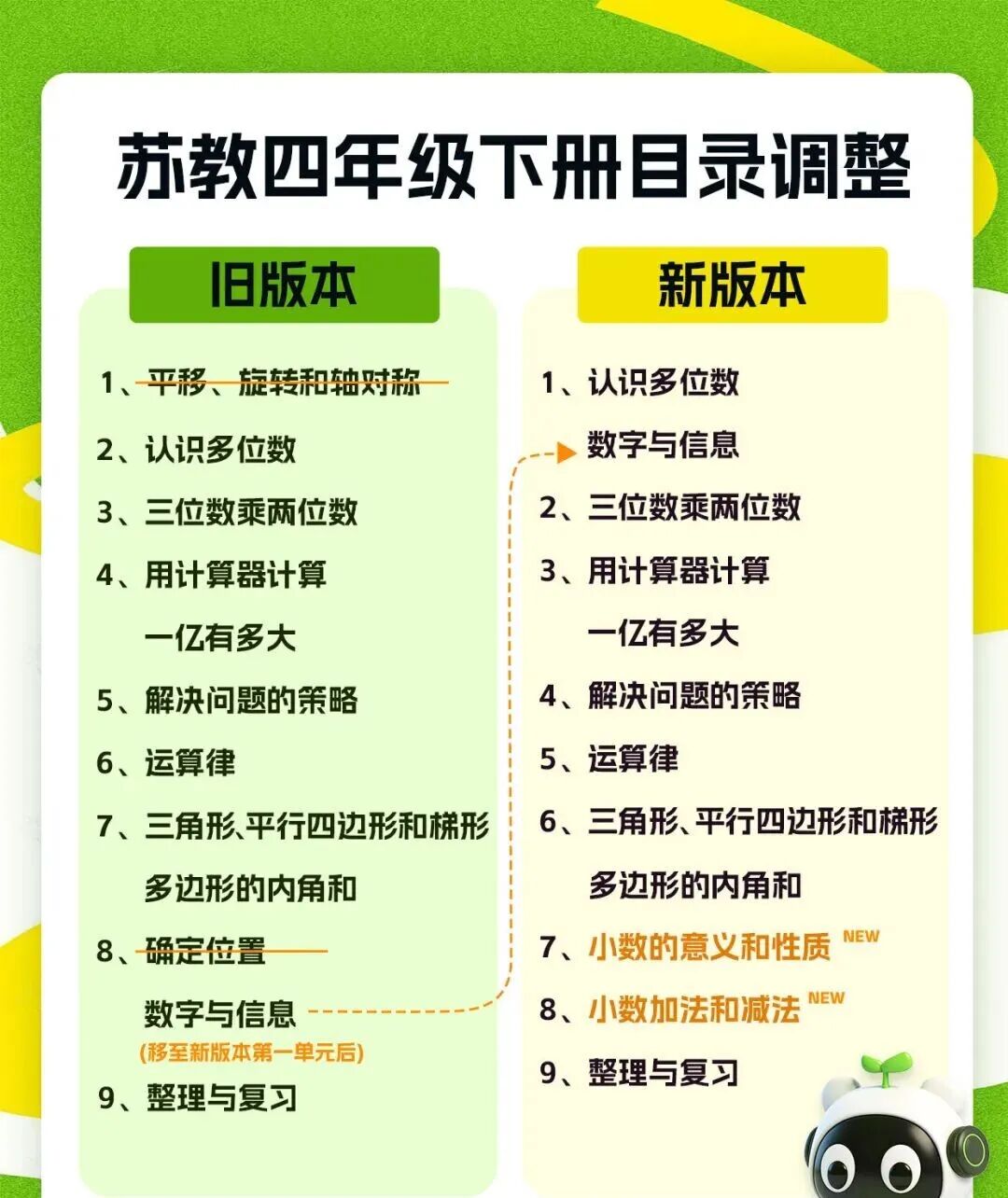 2026春学期,苏教版数学教材四、五年级也做了调整。以下为新教材目录内容的具体变化情况: