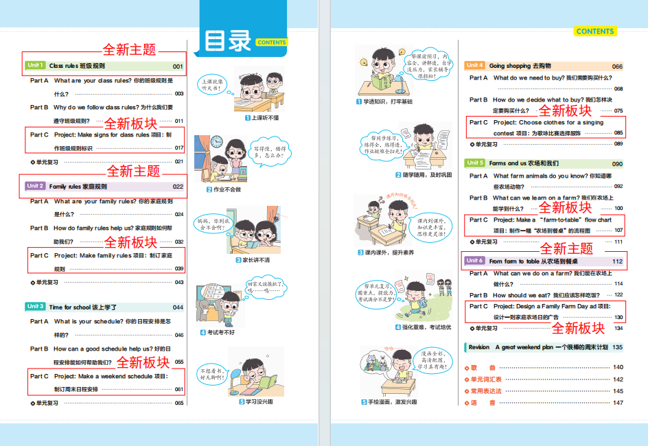 增加了两个跨学科主题学习,契合新课标要求,培育学生的核心素养。