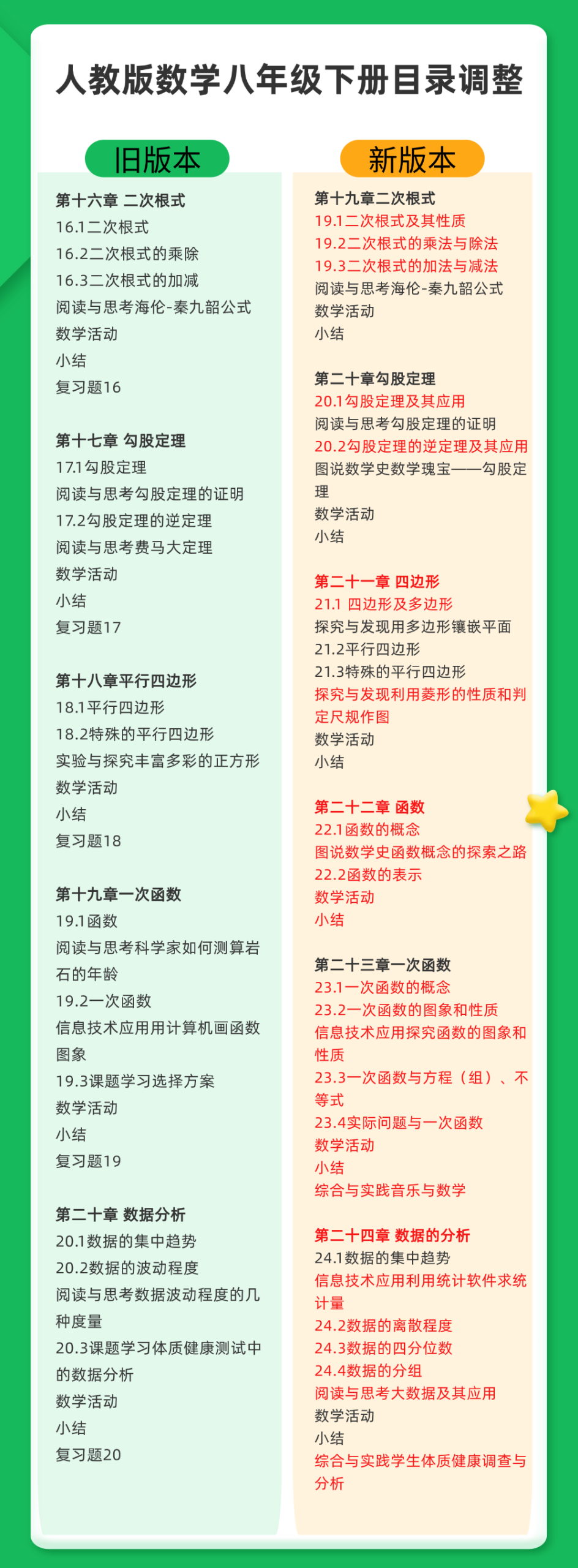 章节从5章变为6章(将一次函数章节拆分为函数与一次函数两章),节数从13节变为18节,教材页码新增60页。