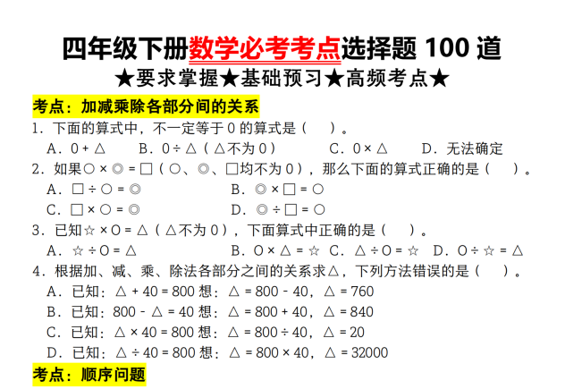 为巩固四年级下册数学核心知识,本站整理发布《必考考点选择题100道》专题练习。题目覆盖四则运算、小数、三角形、统计等全册重点单元,每道题均针对高频考点设计,附详细解析。适合单元复习、期末冲刺使用,帮助学生快速检测知识漏洞,提升解题熟练度与应试能力。