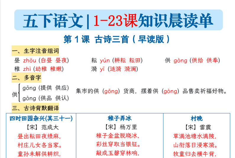 本套《五下语文1-23课每课知识晨读单》共31页,覆盖全册23课的核心知识点,包括重点字词、多音字、近反义词、课文背诵段落及常考句式。每天晨读一课,帮助学生在朗读中强化记忆,轻松掌握每课基础,培养语感。家长可直接打印使用,是课前预习、课后复习的好帮手!