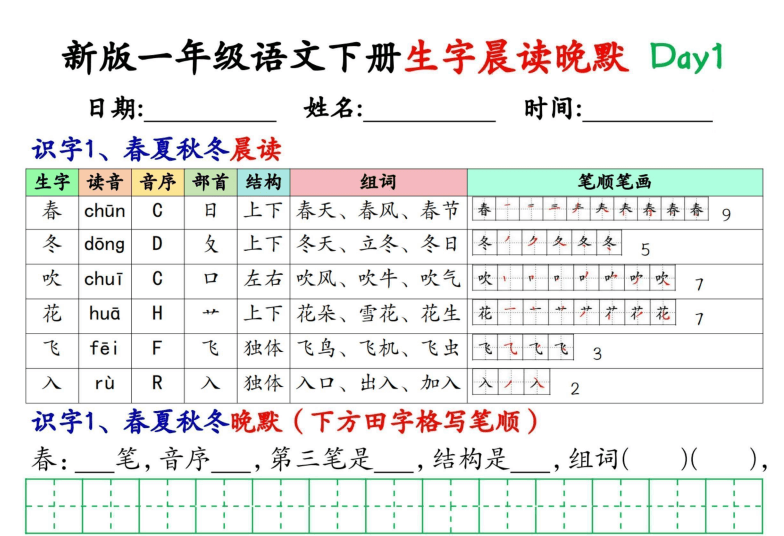 本套《新一下语文生字晨读晚默36天》资料共36页,按天设计学习任务,每天包含晨读识记和晚默检测两个环节,全面覆盖一年级下册所有重点生字。晨读部分提供拼音、笔顺、组词,帮助孩子多角度记忆;晚默部分通过填空、书写等形式检验学习效果。每天一页,36天轻松攻克生字难关,培养良好学习习惯。家长可直接打印使用,高效实用!