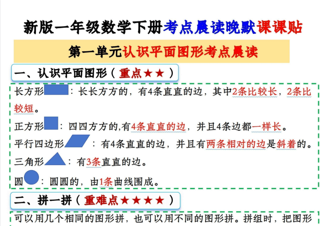 家长们看过来!为了帮助孩子们更好地掌握一年级下册的数学知识点,我们特意整理了这份 《一年级下册数学考点晨读晚默课课贴》