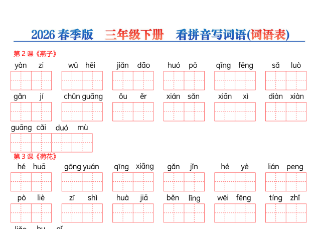 本资料为2026年春季学期三年级下册语文《看拼音写词语—词语表》完整版,涵盖全册重点词语,帮助学生在拼音练习中巩固字词基础,提升拼写能力。适合课后复习、家庭作业或阶段性检测使用。欢迎在知学资源网下载打印,便捷实用,助力语文学习!