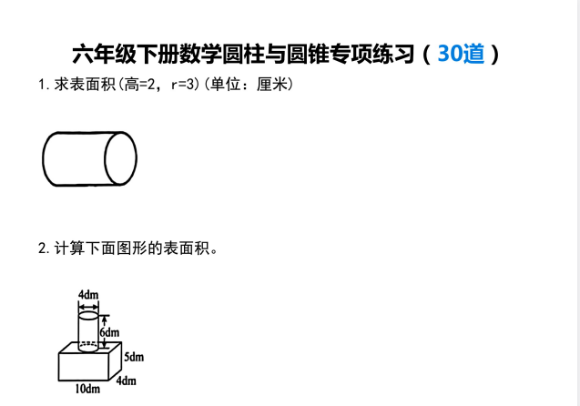本资料为六年级下册数学《圆柱与圆锥专项练习》,共精选30道题目,涵盖圆柱与圆锥的表面积、体积、综合应用等核心题型,帮助学生强化空间观念,提升解题能力。适合单元复习、期末冲刺或小升初专项训练使用。欢迎在知学资源网下载使用,助孩子轻松攻克几何难点!