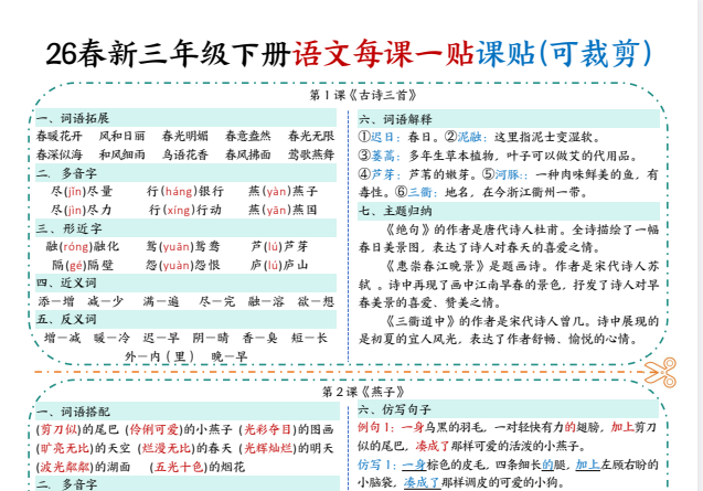 本资料为最新版三年级下册语文《每课重点课课贴》,一课一贴,涵盖每课生字组词、多音字、近反义词、课文重点和中心思想等内容。设计小巧精致,可裁剪粘贴于课本对应课次,方便学生随时复习巩固,提升学习效率。适合课前预习、课堂笔记和课后复习使用。欢迎在知学资源网下载打印,让孩子学习更轻松!