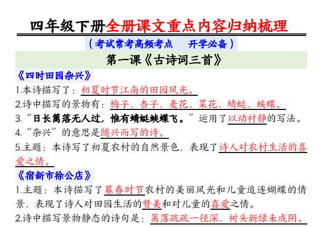 人教版四年级下册语文(课文重点内容梳理),共16页,电子版可下载可打印,这份四下语文课文重点内容汇总,帮助孩子深度理解课文,快速把握文章主旨,提升语文素养。需要的家长抓紧打印出来,让孩子读一读,背一背吧!