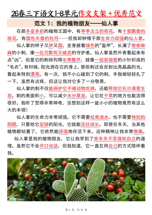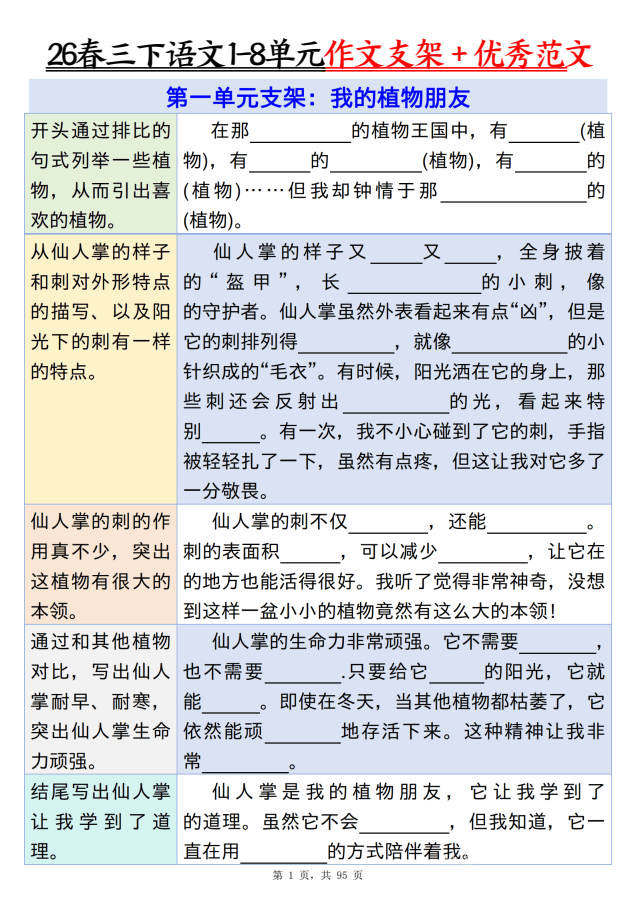 本资料为最新版三年级下册语文1-8单元同步习作范文,共85篇优秀范文,紧扣每单元习作主题,涵盖写人、记事、写景、状物等各类题材。范文语言生动、结构清晰,贴近学生生活实际,为孩子提供丰富的写作参考和灵感启发。适合单元习作指导、考前复习及日常积累使用。电子版可打印,欢迎在知学资源网下载使用,助力孩子轻松写好作文!