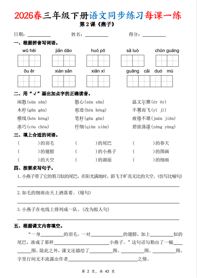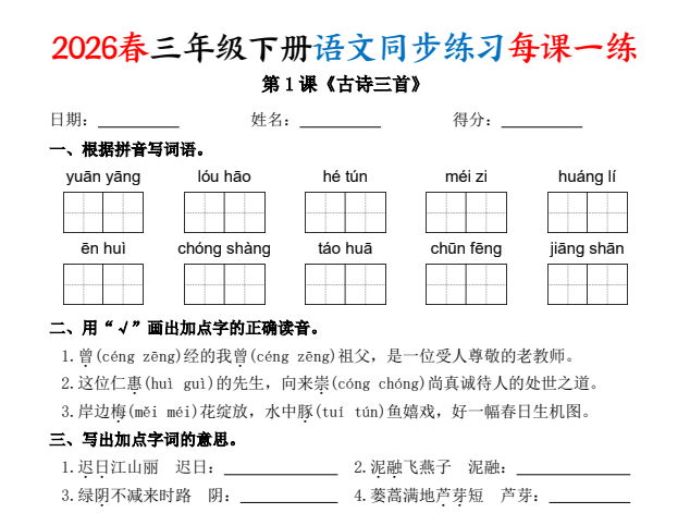 本资料为最新版三年级下册语文《每课一练》(课课练),一课一练,覆盖全册所有课时。每课设有字词积累、句子训练、阅读理解等题型,紧扣教材重点,帮助学生及时巩固课堂所学,提升语文综合能力。适合课前预习、课后巩固及阶段性复习使用。电子版可打印,欢迎在知学资源网下载使用!