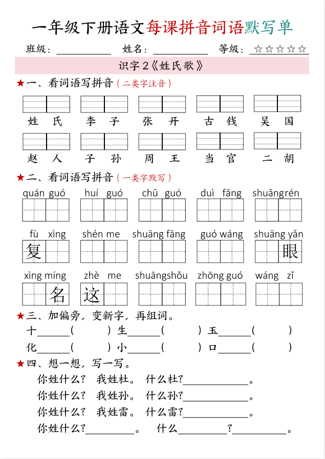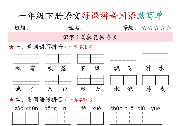 本资料为2026年春季最新版一年级下册语文《每课拼音词语默写单》,涵盖全册每课重点拼音和词语,帮助学生巩固拼音拼读与字词书写能力。每课一练,方便学生自主默写、家长检测,夯实语文基础。适合课前预习、课后复习及期末冲刺使用。电子版可打印,欢迎在知学资源网下载使用!