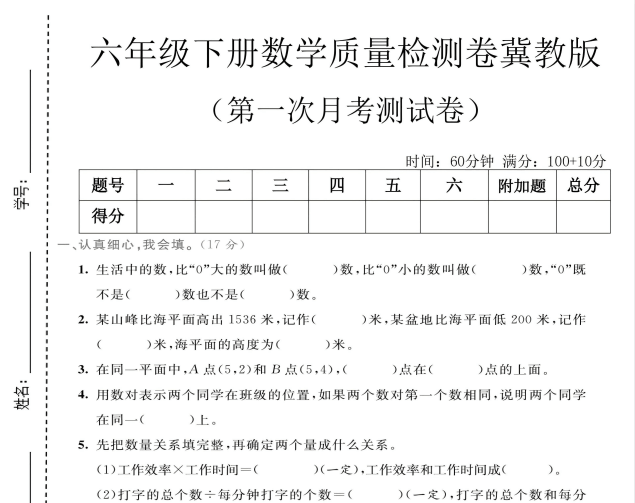 本套冀教版六年级下册数学第一次月考质量检测卷,紧扣教材前两个单元的重点知识,包括负数、百分数等核心内容。试卷题型丰富,涵盖填空、判断、选择、计算及应用题,难度适中,并附有详细参考答案,方便学生自查与家长辅导。适合教师用于课堂测验或学生课后复习巩固,帮助检测阶段性学习成果。欢迎下载使用!