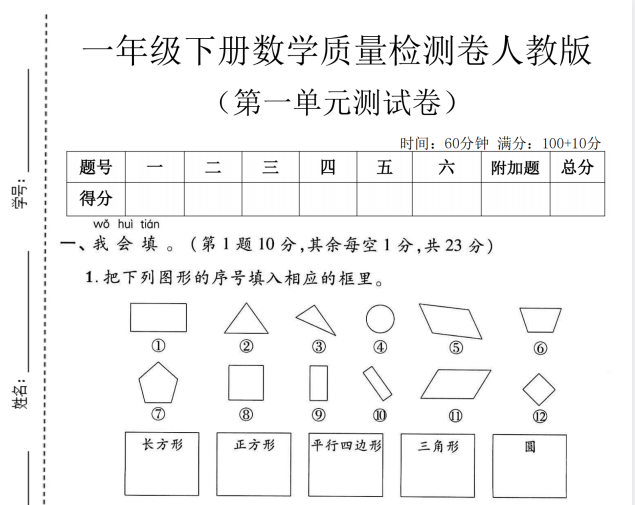 本资料为2026年春季人教版一年级下册数学《质量检测卷》第一单元专版,包含1套高质量单元质量检测卷及详细参考答案。试卷紧扣教材第一单元核心知识点,题型涵盖基础计算、图形认知、生活应用等,注重考查学生知识掌握与运用能力,帮助学生及时检测学习成果,查漏补缺。高清电子版,可打印,适合单元复习、阶段测评及家长辅导使用。欢迎在知学资源网下载使用!