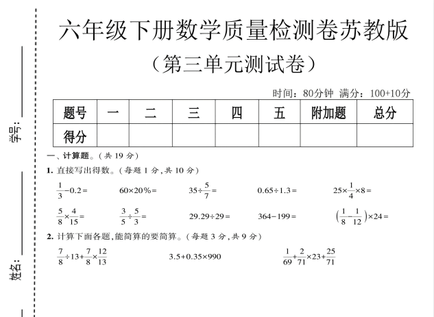 本资料为苏教版六年级下册数学第三单元质量检测卷,紧扣教材第三单元核心知识点,题型设计科学合理,涵盖单元重点、难点及综合应用,全面考查学生对知识的掌握程度和解题能力。试卷难度梯度适中,适合单元复习、阶段测评及小升初专项训练使用。电子版可打印,欢迎在知学资源网下载使用!