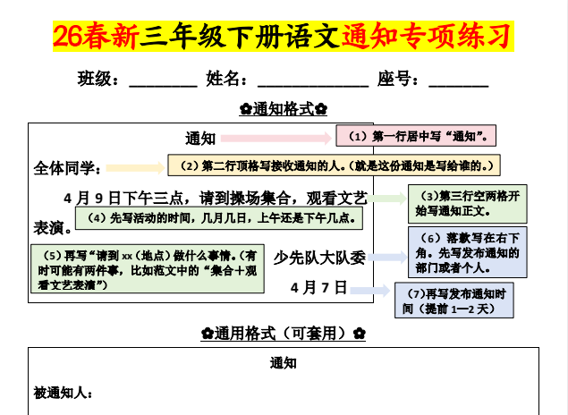 本资料为三年级下册语文《通知专项练习》,紧扣教材通知写作要求,涵盖通知格式填空、要素分析、病文修改及情景写作等多种题型,帮助学生系统掌握通知的格式规范与写作技巧。题目设计贴近生活实际,注重应用能力培养,适合单元复习、期中期末冲刺及专项强化使用。电子版可打印,欢迎在知学资源网下载使用!
