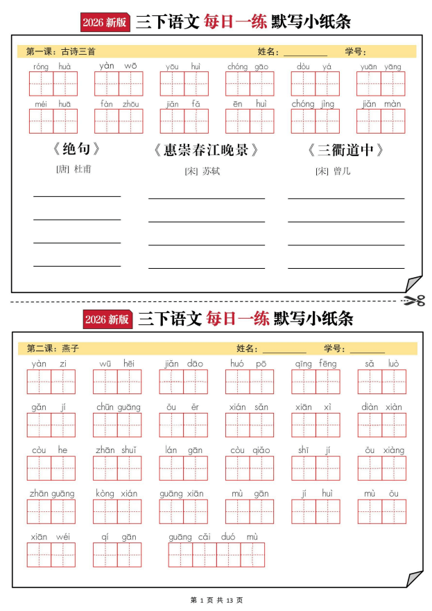 本资料为2026年春季三年级下册语文《默写小纸条》,涵盖全册重点字词、必背古诗、课文要点及易错内容,每日一练,小巧便携,帮助学生巩固基础知识,提升书写与记忆效率。题型包括看拼音写词语、古诗默写、句子填空等,适合课前预习、课后巩固及期末复习使用。电子版可打印,欢迎在知学资源网下载使用!