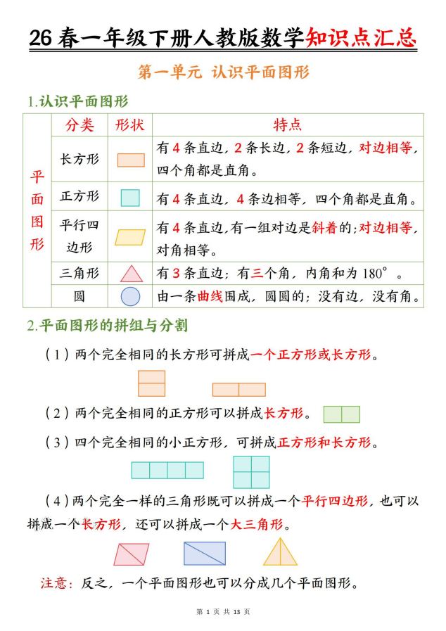 本资料为2026年春季人教版一年级下册数学《知识点汇总》,共13页,系统梳理全册核心知识点,涵盖认识图形、20以内退位减法、100以内数的认识、人民币换算、找规律、解决问题等重点内容。图文并茂,条理清晰,帮助学生快速构建知识框架,巩固基础,提升复习效率。适合课前预习、课后巩固及期末系统复习使用。高清PDF电子版可打印,欢迎在知学资源网下载使用!