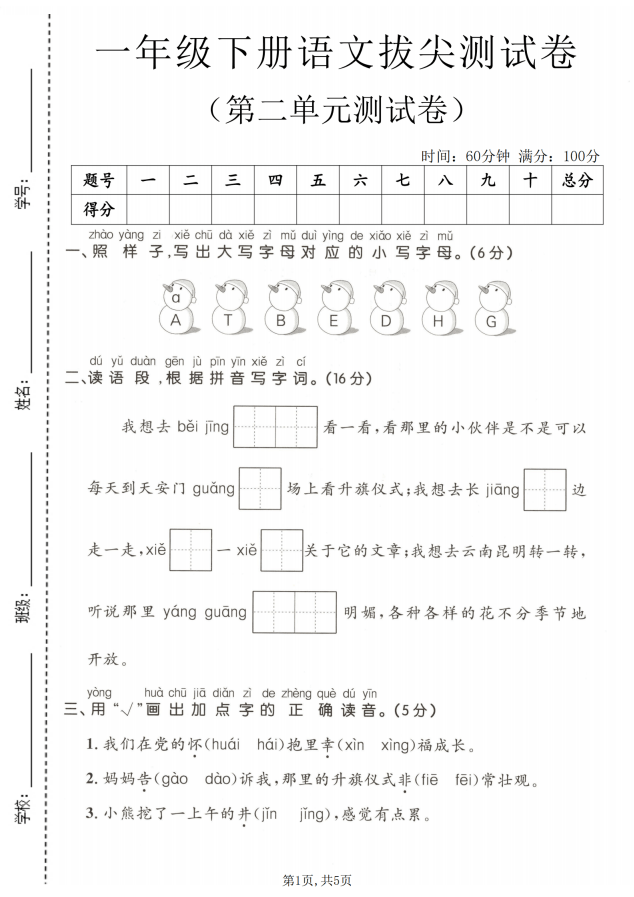 本资料为一年级下册语文第二单元拔尖测试卷,紧扣教材单元重点,涵盖拼音、字词、句子、阅读等核心考点,题型设计灵活多样,难度适当拔高,全面考查学生的知识掌握与综合运用能力。适合单元复习、阶段检测及优生培优使用。电子版可打印,欢迎在知学资源网下载使用!
