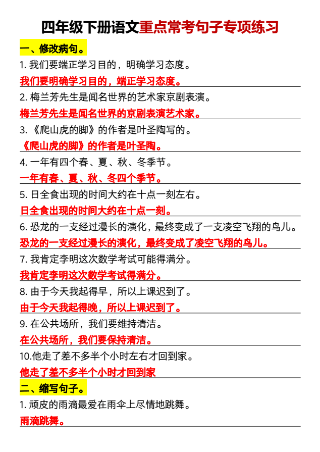本套《四年级下册语文重点常考句子专项练习》紧扣教材及课标要求,系统覆盖了缩句、扩句、把字句/被字句转换、仿写句子、修改病句及关联词运用等核心题型。