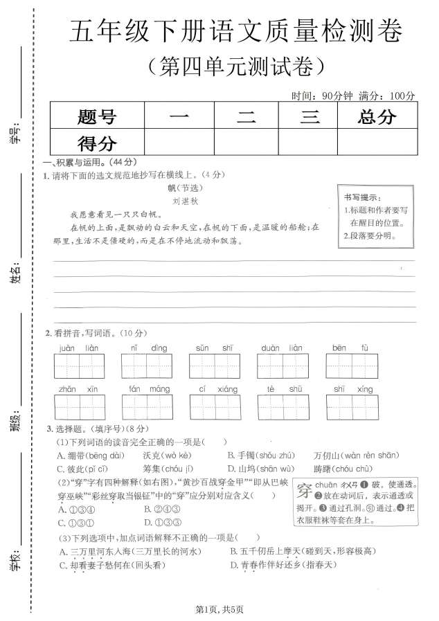 本资料为五年级下册语文第四单元质量检测卷,紧扣教材单元重点,涵盖基础知识、阅读理解、课内外积累及写作等核心考点,题型设计科学全面,难度适中,帮助学生系统检测单元学习效果,查漏补缺。适合单元复习、阶段测评及课后巩固使用。电子版可打印,欢迎在知学资源网下载使用!