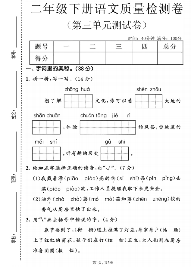 本套检测卷紧扣二年级下册语文第三单元知识点,涵盖识字、词语搭配、阅读与写话,题型基础,难度适中,适合课后复习与阶段自测。欢迎下载使用。 夸克网盘 声明:本网站为公益学习平台,所有资料均收集于网络,仅供个人学习参考,版权归原作者所有。请勿用于商业用途。如涉及侵权,请联系我们,我们将立即处理。使用者需对内容自行判断并承担责任。