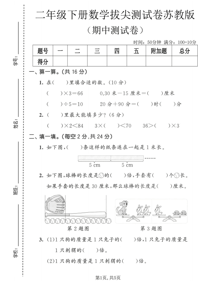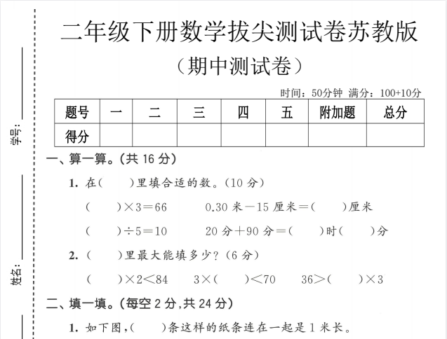 本资料为《苏教版二年级下册数学期中拔尖测试卷》,专为学有余力的学生设计。试卷紧扣苏教版教材前四个单元核心知识点,涵盖有余数的除法、时/分/秒、认识方向及万以内数的初步认识。题型设置灵活多变,难度高于常规练习,旨在提升学生的逻辑思维与综合解题能力。适用于期中复习冲刺及培优训练,欢迎下载使用。