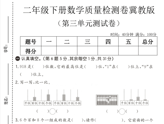 本资料为《冀教版二年级下册数学第三单元质量检测卷》,紧密贴合教材第三单元教学内容与考查目标。试卷题型全面,涵盖填空、判断、选择、计算及解决问题等常见题型,难度适中,旨在帮助学生查漏补缺,检验阶段性学习成果。适合单元复习自测、课堂小测及家长辅导使用,欢迎下载打印。