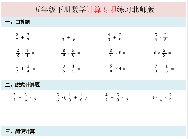 本资料为《北师版五年级下册数学计算专项练习》,针对分数加减乘除、混合运算及解方程等核心计算模块进行系统强化。题目设计由易到难,注重算理理解与计算速度的双重提升。适合五年级学生课后日常训练、期中期末计算部分冲刺及运算能力薄弱环节的查漏补缺,欢迎下载打印使用。
